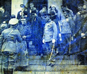 图片是11月11日溥仪应邀参加各国使团和军界要人在天津举办的所谓的“欧战休战纪念典礼”时的留影,地点是在天津开滦矿务局楼门前,即现在的中共天津市委大楼前。