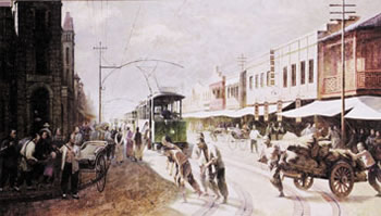 1904年4月26日,袁世凯允准比国商人创立天津电车电灯股份有限公司,委派天津知府凌福彭等与洋商海礼订立合同。规定以旧城鼓楼为中心,方圆3公里内为公司经营范围。资本25万英镑,为当时天津外商投资最大的企业。1906年春,比商电车电灯公司举行“白牌电车”通车典礼。“白牌电车”是环旧城行驶的有轨电车,这是全国创办的第一条有轨电车。其后又陆续开辟红牌、蓝牌和黄牌电车,各路线均由北大关起,分别以老龙头车站、海关为终点。(画/杨明 文/罗澍伟)